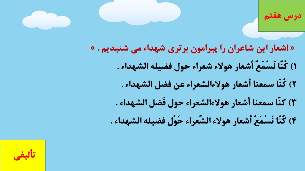 فعل « می شنیدیم » باید ( کُنّا نَسْمَعُ ) تعریب شود . رد گزینه 2 و 3 همچنین « این شاعران » باید « هولاء الشعرا » تعریب شود . رد 1 .
