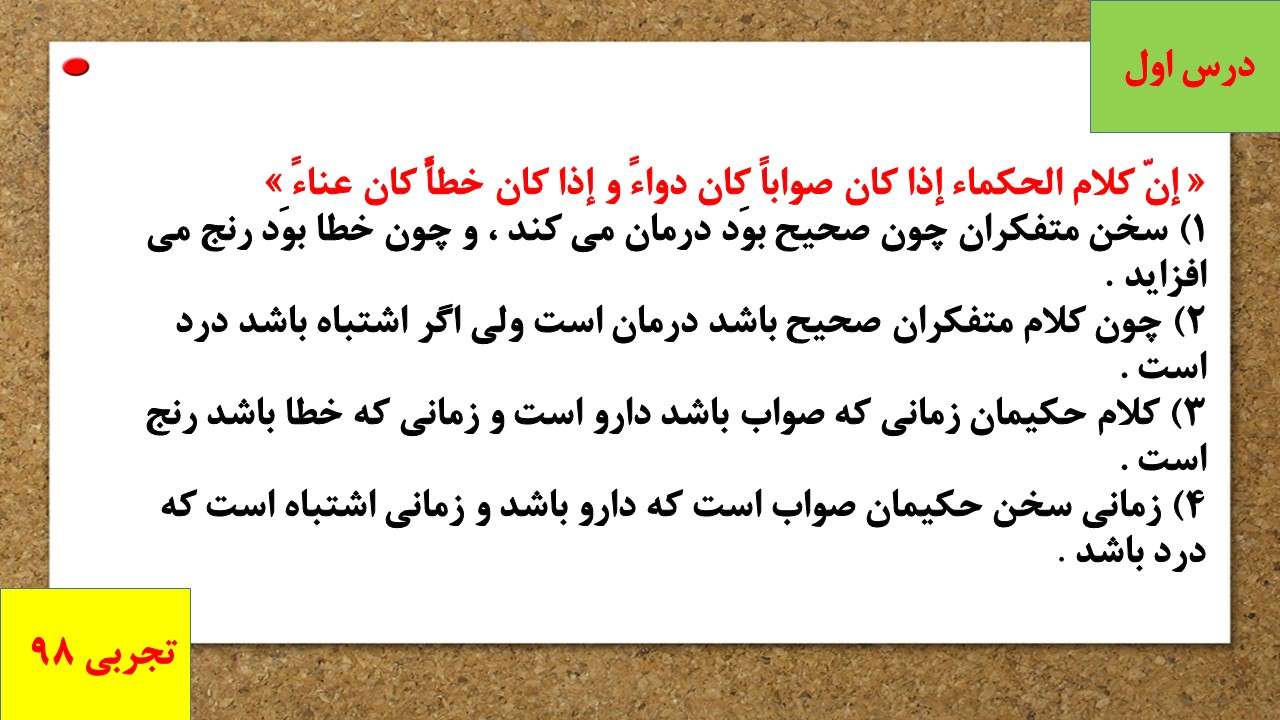 « کان » در عبارت « إذا کان » شرط است و باید به صورت مضارع التزامی ترجمه شود . در ضمن در همین گزینه ، عبارت ها جا به جا ترجمه شده است . رد گزینه 4 . همچنین « دواء » و « عناء » در گزینه 1 ، به صورت فعلی ترجمه شده است . « ولی » معادل عربی ندارد . رد گزینه 2 .