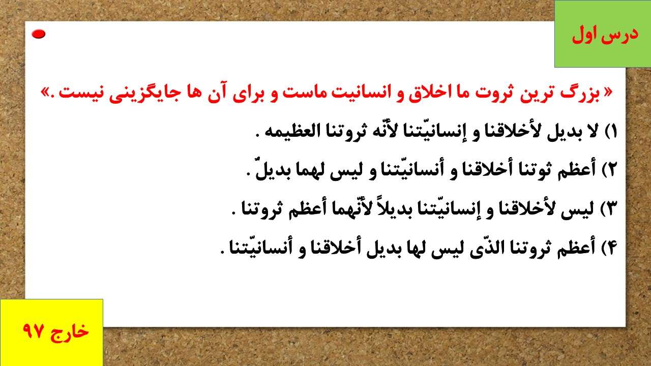 « بزرگ ترین ثروت ما » باید به صورت ( أعظم ثروتنا ) ترجمه شود . رد گزینه 1 « برای آن ها جایگزینی نیست » ( لیس لهما بدیل ) .