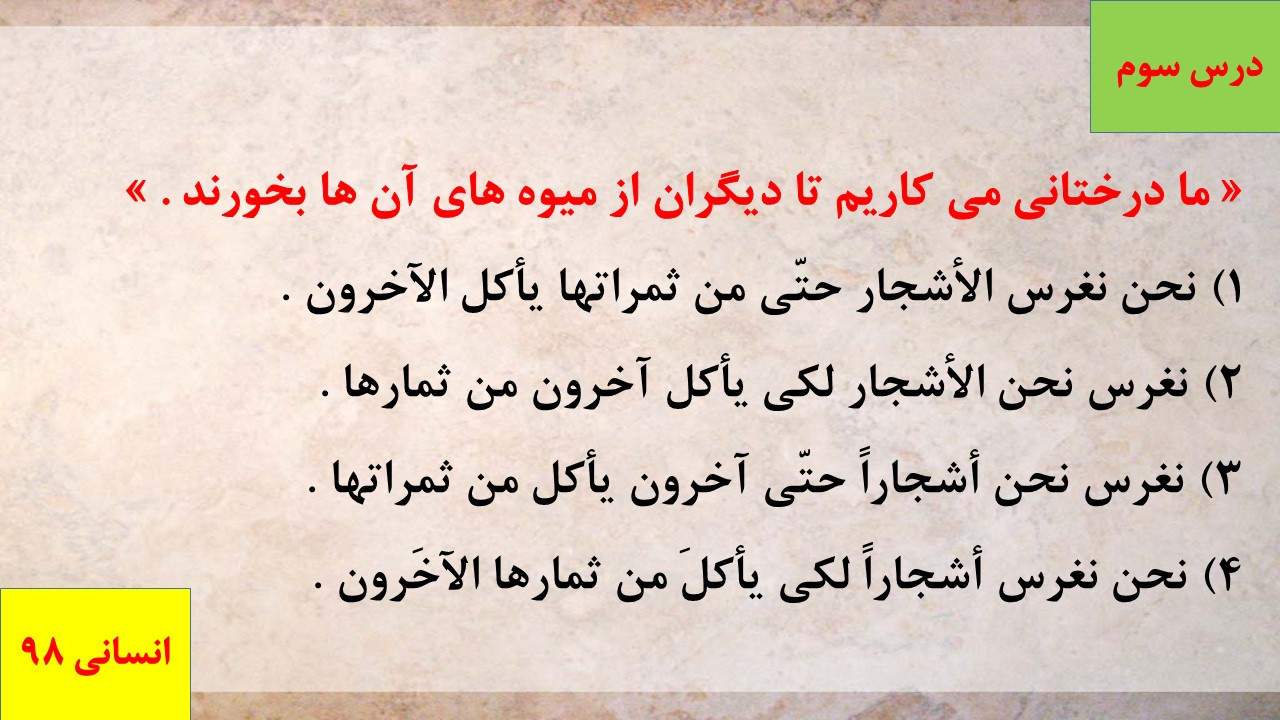 « درختانی » نکره است . رد گزینه های 1 و 2 . در گزینه 3 هم ( نحن ) اضافی است و همچنین بعد ( حتی ) باید فعل بیاید نه این که اسم بیاید . در ضمن ( آخرون ) با( یأکل ) تناسب ندارد . پاسخ گزینه 4 است .