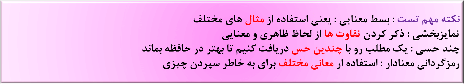 1)بسط معنایی 2)تمایزبخشی 3)مطالعه ی چند حسی 4)رمزگردانی معنادار