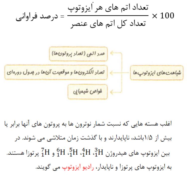 نکته: ایزوتوپ ها خواص شیمیایی یکسانی دارند ولی برخی خواص فیزیکی وابسته به جرم آن ها مانند چگالی متفاوت است.