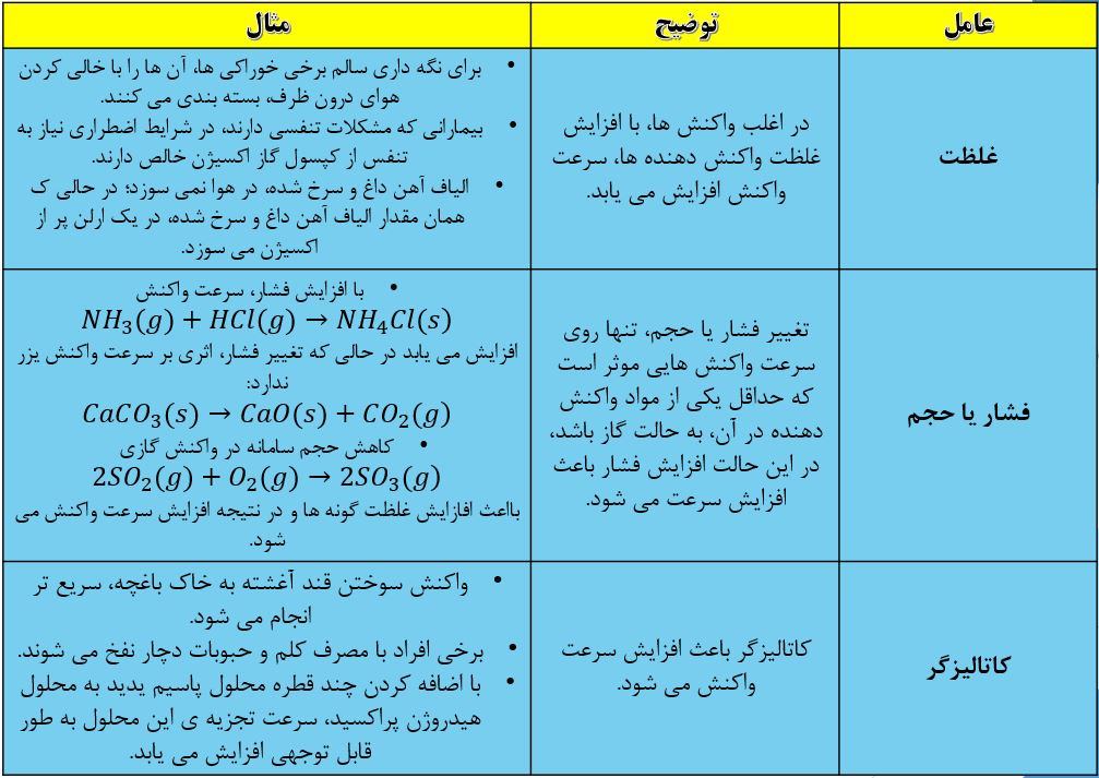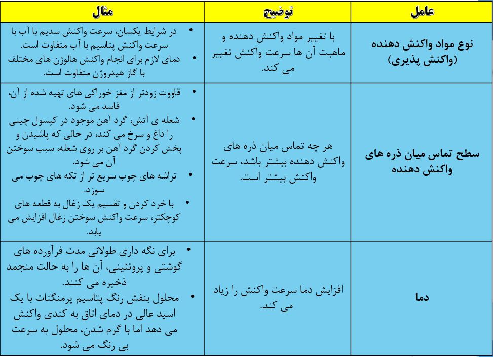 سرعت انجام واکنش به نوع مواد واکنش دهنده، سطح تماس واکنش دهنده ها، غلظت واکنش دهنده ها، دما و کاتالیزگر وابسته است.