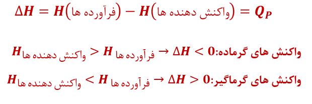 انجام واکنش همراه با داد و ستد انرژی در واکنش ها همراه است که این انرژی به شکل گرما ظاهر می شود. تغییر آنتالپی هر واکنش هم ارز با گرمایی است که در فشار ثابت با محیط مبادله می شود و با Qp نمایش داده می شود.