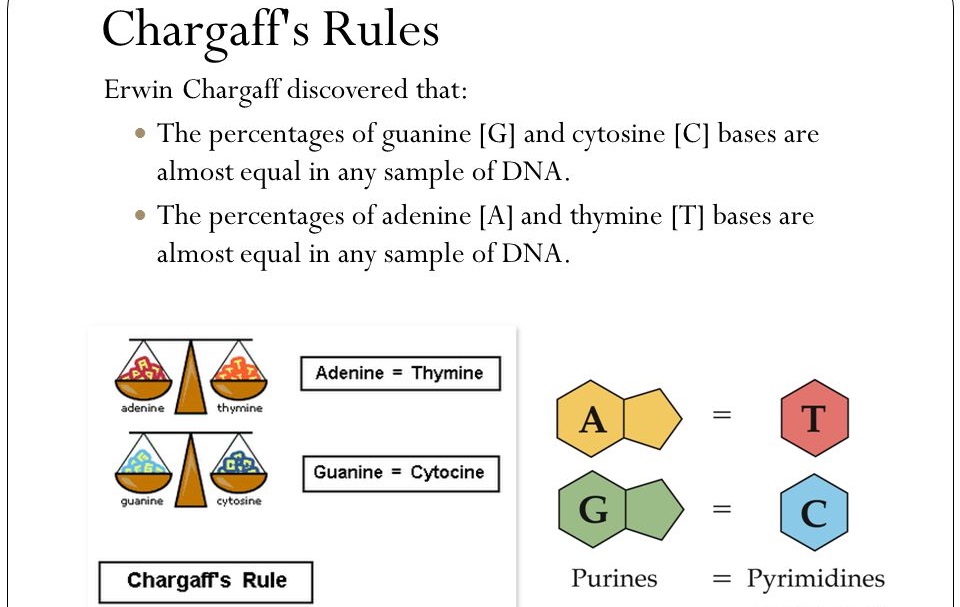 - دقت کنید خود چارگاف علت برابری باز های آلی مکمل را تشخیص نداد. بلکه علت برابری، بعد ها و توسط واتسون و کریک تشخیص داده شد.