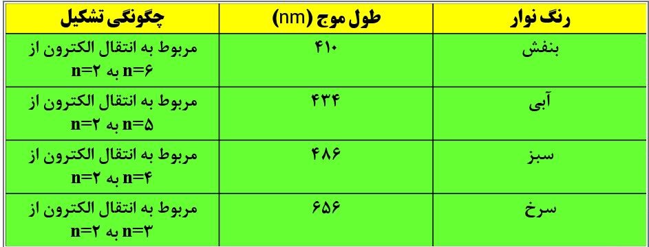 طیف نشری خطی هیدروژن دارای 4 خط به رنگ های بنفش، آبی، سبز و قرمز می باشد.