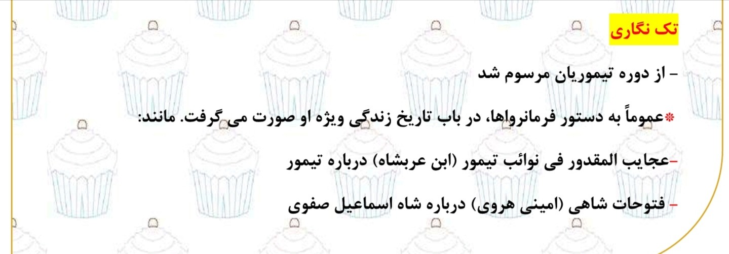 4-تاریخ های سلسله ای 5- تک نگاری 6- تاریخ های منظوم 7-نامه ها