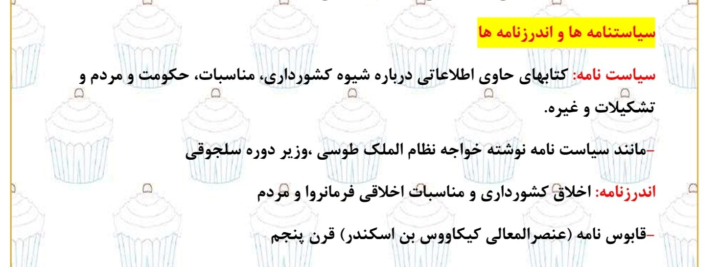 8- نوشته های جغرافیایی 9- متون ادبی 10- سیاست نامه ها و اندرزنامه ها 11- سایر نوشته ها