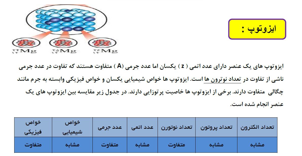 در این مطلب خلاصه درس مبحث آیا همه ی اتم های یک عنصر پایدارند و مبحث ایزوتوپ ها از فصل کیهان زادگاه الفبای هستی برای آمادگی بیشتر شما عزیزان در آزمون 23 مهر آورده شده است. سوالات خود را در صفحه مقطع دهم ریاضی و دهم تجربی کامنت کنید تا در اسرع وقت به آن ها پاسخ بدهیم.