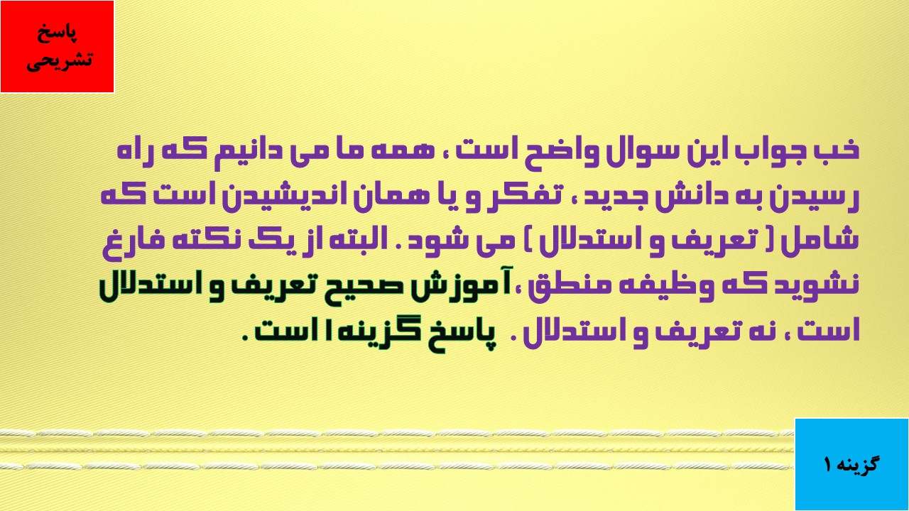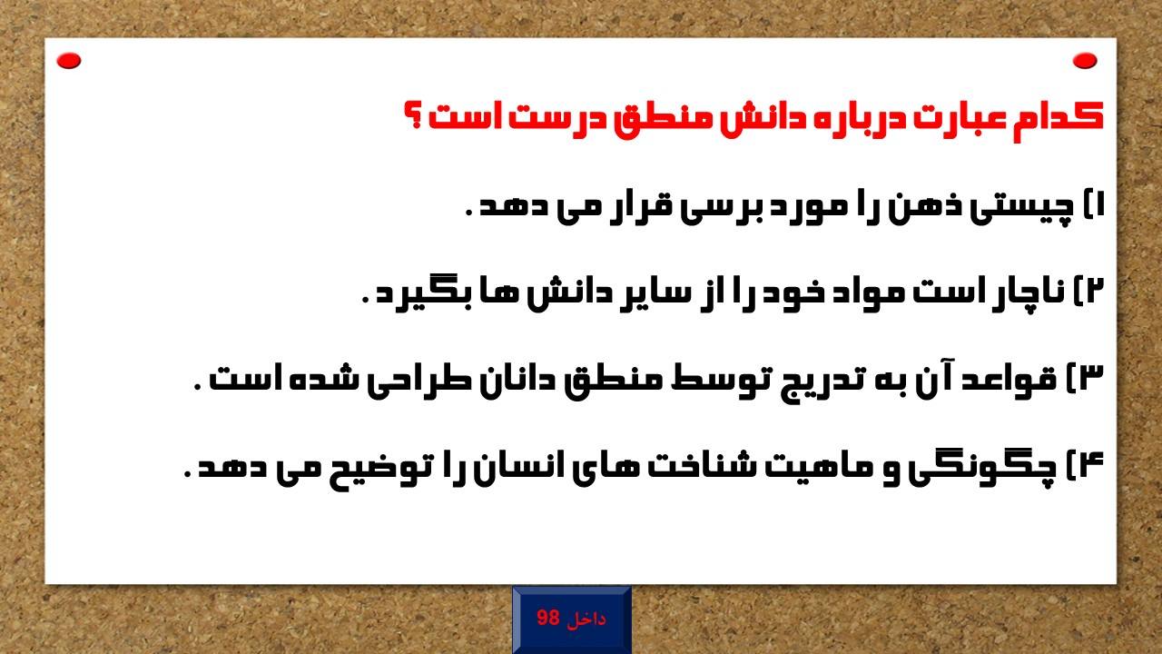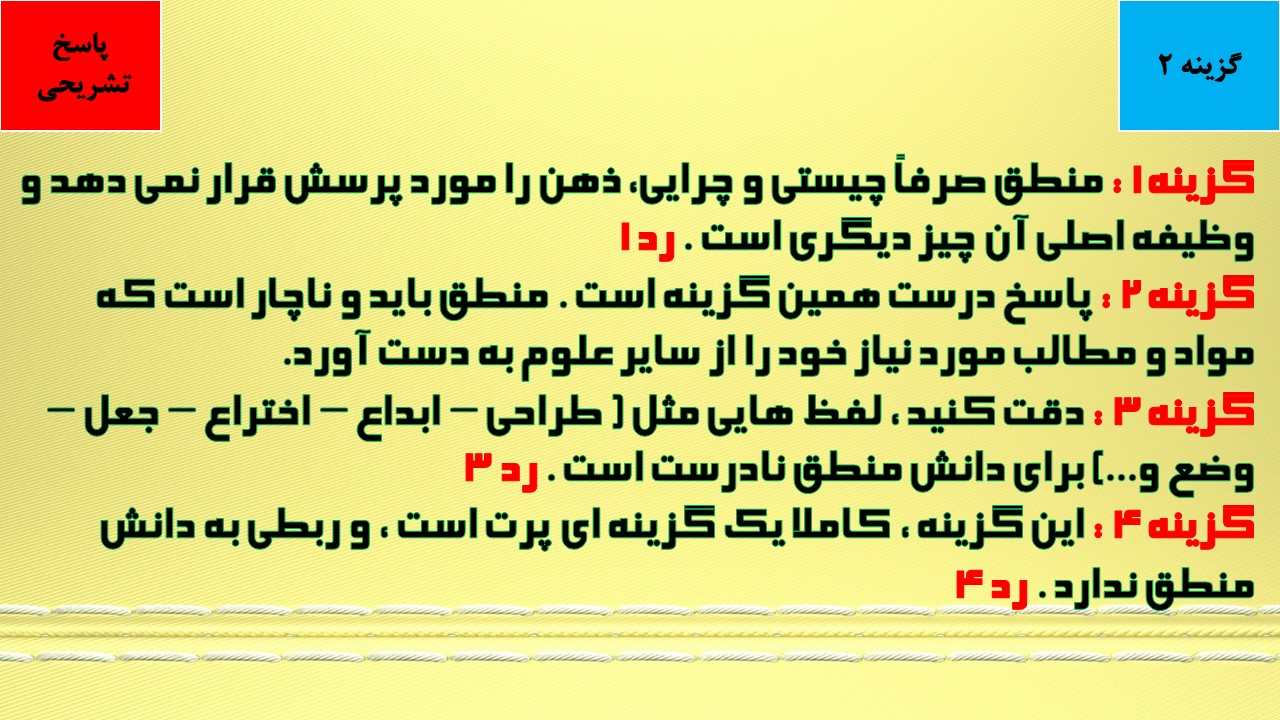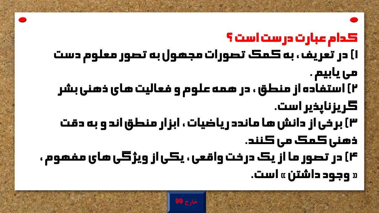 منطق هم به حوزه چیستی ها ( تعریف ) مربوط است هم به حوزه چرایی ها ( استدلال ) ( کنکور 98 )