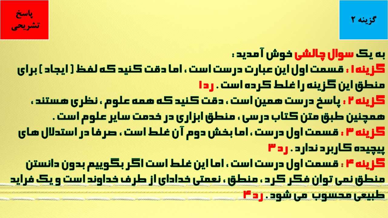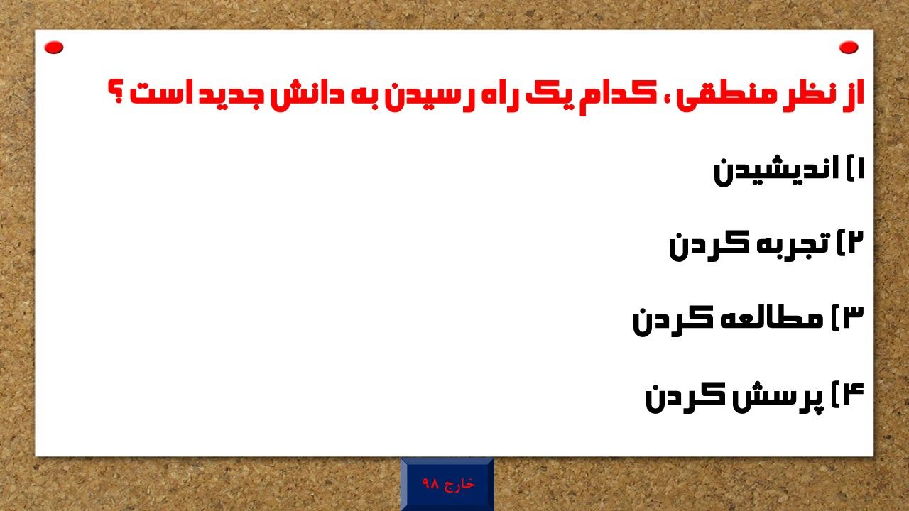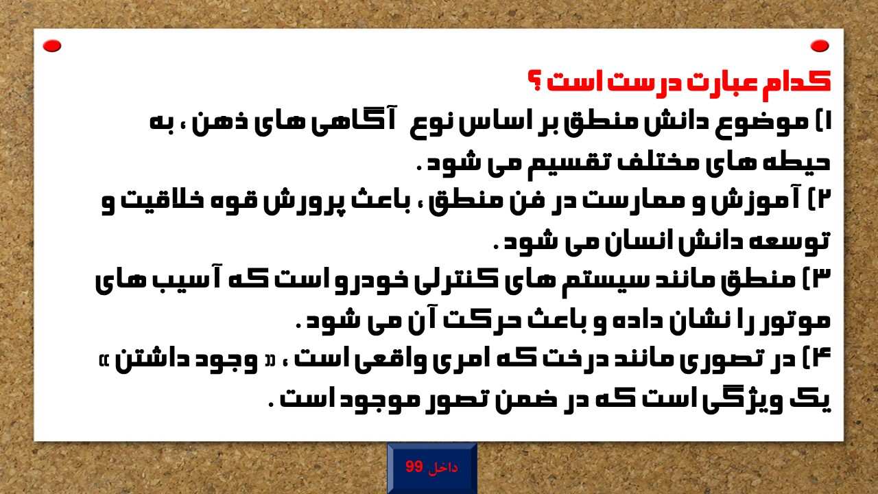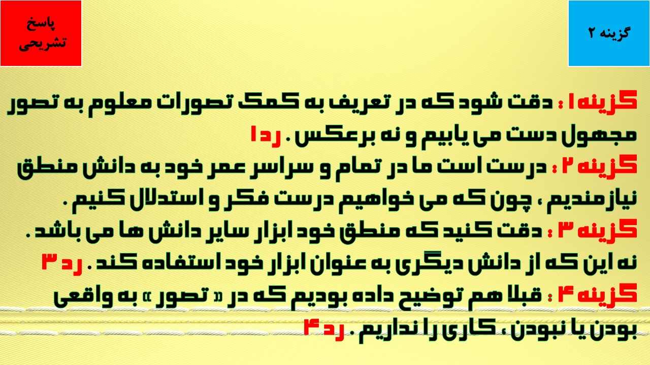 منطق هم به حوزه چیستی ها ( تعریف ) مربوط است هم به حوزه چرایی ها ( استدلال ) ( کنکور 98 )