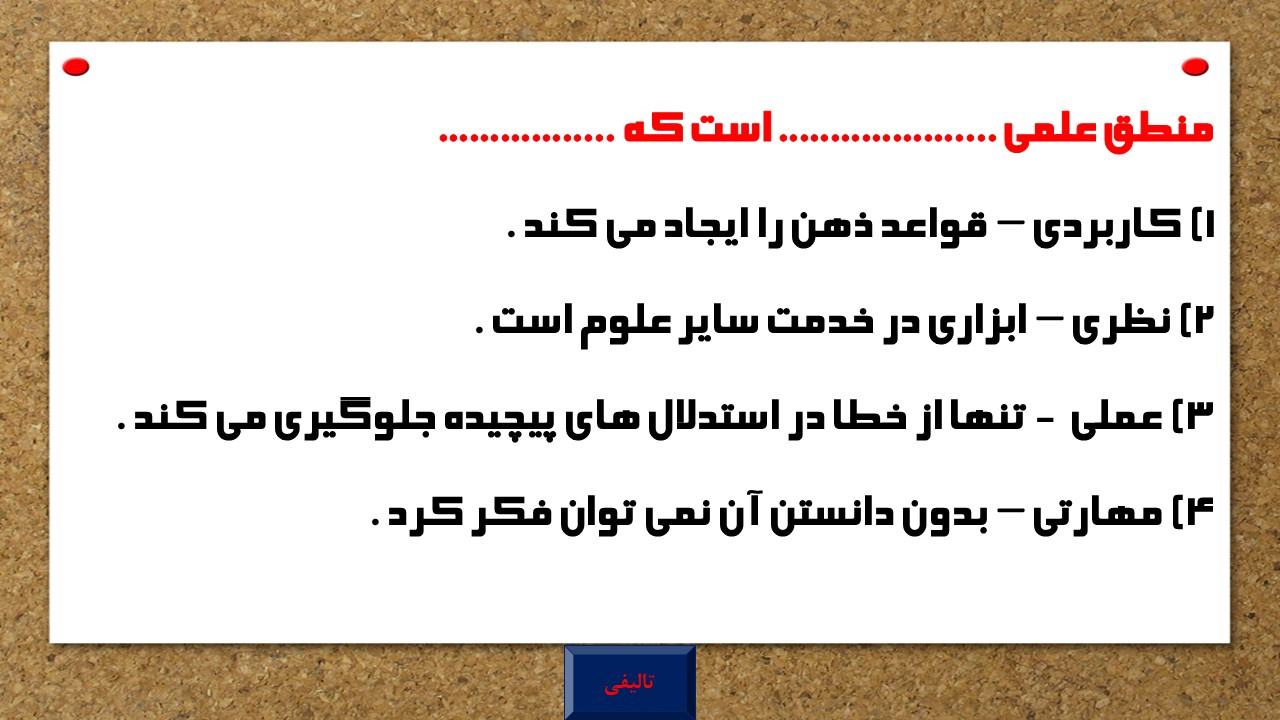 یکی دیگر از جنبه های کاربردی بودن منطق این است که دانستن آن مانع بروز خطا نمی شود بلکه به کار بستن آن مانع برخی خطاهای ذهنی میشود. ( کنکور 99 )