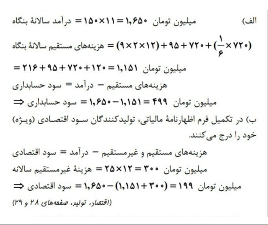 تست3: جدول زير اطلاعات مربوط به هزينه هاي يك بنگاه اقتصادي را نشان مي دهد. در صورت اجاره دادن كارگاه و ماشين آلات توليدي، صاحب اين بنگـاه، ميتواند ماهانه 25 ميليون تومان به دست مي آورد. با توجه به مندرجات فوق و اطلاعات جدول: الف) سود حسابداري اين بنگاه در طول يك سال چقدر است؟ ب) ميزان سود ساليانه اي كه صاحب اين بنگاه در اظهارنامة مالياتي خود درج خواهد كرد، چقـدر اسـت؟ (صـاحب ايـن بنگـاه خـود مالـك كارگـاه و ماشينآلات مورد استفاده است) آزمون 21 خرداد1400