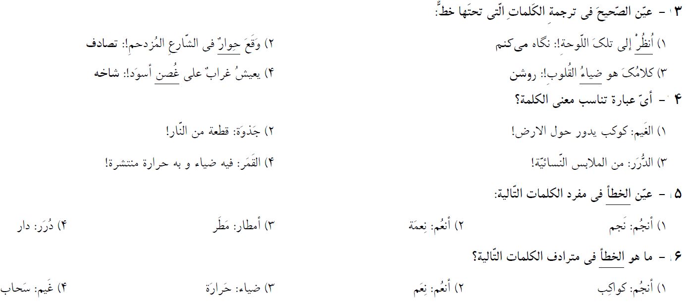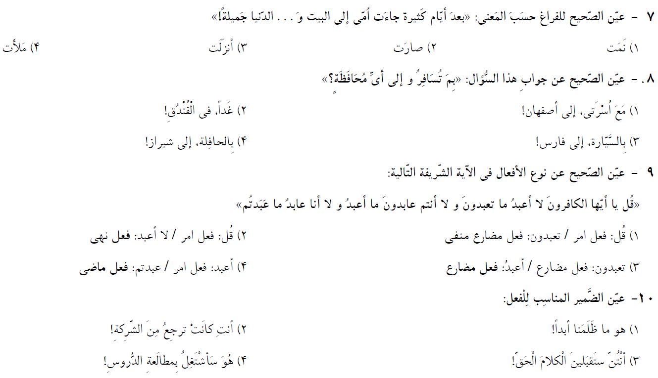 10 سوال عربی دهم که در ادامه برای شما قرار دادیم، از مباحث آزمون 23 مهر بوده و برای آمادگی بیشتر شما در این آزمون توسط فاطمه احدزاده رتبه 373 رشته ریاضی سال 95 انتخاب و برای شما قرار داده شده است. بعد از مطالعه ی کتاب درسی و درسنامه های آمادگی آزمون 23 مهر، توصیه میکنم حتما این سوالات را حل کرده و جواب های خود را با پاسخنامه بررسی کنید.