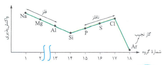 توجه:هر چه یک نافلز، تمایل بیش تری برای گرفتن الکترون داشته باشد، واکنش پذیری و خصلت نافلزی بیش تری دارد.