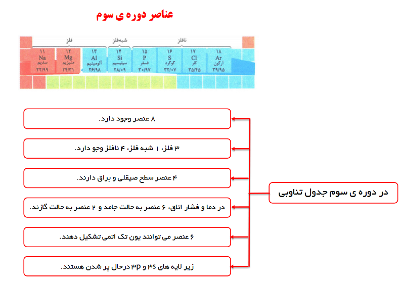 نکته: خصلت فلزی در یک دوره از چپ به راست، کاهشو خصلت نافلزی در یک دوره از چپ به راست، افزایش می یابد.