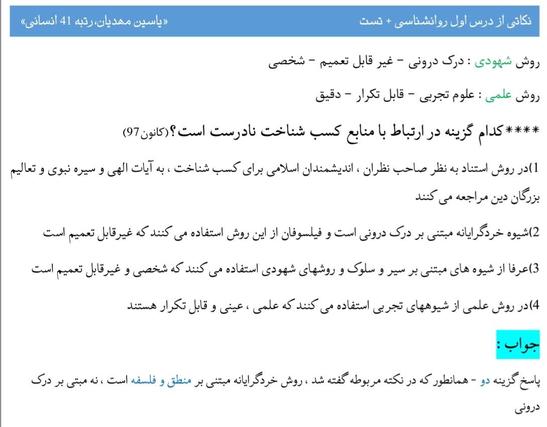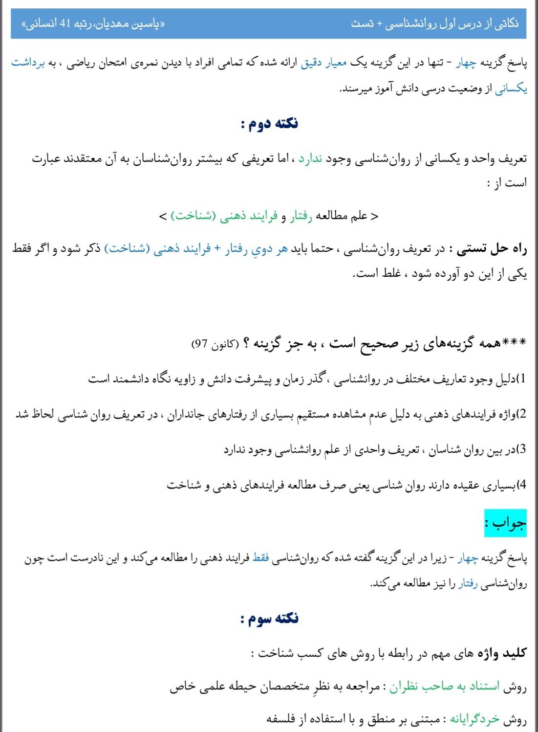 سلام کنکوری های عزیز بنده یاسین مهدیان رتبه 41 کنکور انسانی و دانشجوی رشته آموزش زبان و ادبیات فارسی هستم.مطلب پایین درسنامه ای هست از درس اول روانشناسی یازدهم.امیدوارم که مفید واقع شود.