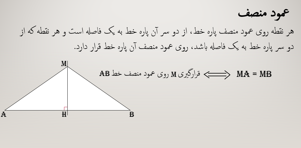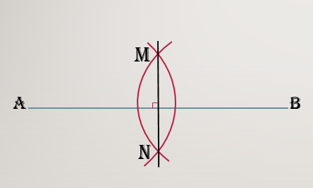 برای رسم عمود منصف پاره خط AB دهانه پرگار را بیش از نصف AB باز کرده و یک بار به مرکز A و بار دیگر به مرکز B و با همان شعاع کمان می زنیم. این دو کمان یکدیگر را در نقاط M و N قطع می کنند. از آنجا که M و N از A و B به یک فاصله هستند، خطی که از نقاط M و N می گذرد، عمود منصف پاره خط AB است.
