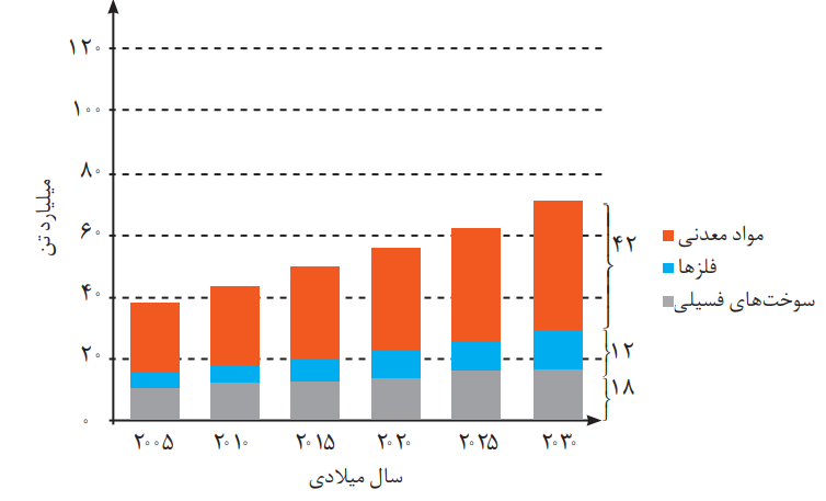 میزان تولید و مصرف مواد مختلف در طی سال های 2005 تا 2030 به صورت: مواد معدنی < سوخت فسیلی < فلزها است