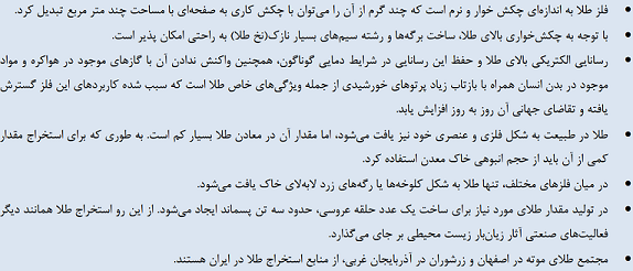 در رابطه با فلز طلا، ویژگی های زیر را به خاطر بسپارید:
