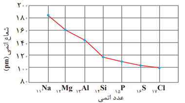 • در یك گروه با افزایش شماره ی دوره، بخاطر بیشتر شدن تعداد لایه های الكترونی، شعاع اتمی عنصر افزایش پیدا میکند. در یك دوره نیز با افزایش شماره ی گروه عناصر، با افزایش مقدار جاذبه ی هسته بر الكترونها، شعاع اتمی عناصر کاهش میابد. نمودار زیر، تغییر شعاع اتمی در دوره سوم جدول دوره ای را نشان می دهد.