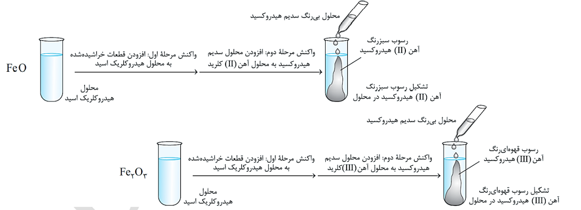 برای شناسایی نوع کاتیون موجود در نوعی از اکسید آهن، از واکنشهای زیر مطابق مراحل داده شده استفاده می کنیم: