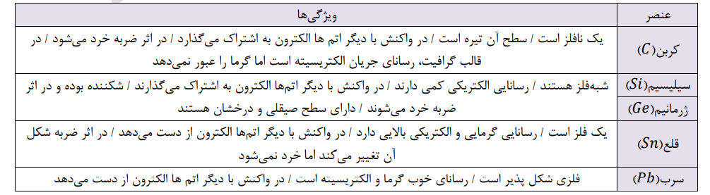 ویژگی های زیر از عناصر گروه 14 جدول دوره ای را به خاطر داشته باشید: