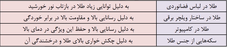 جدول زیر، کاربردهای ویژه ی طلا در وسایل مختلف را نشان می دهد: