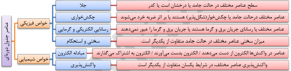 • خصلت فلزی در یك دوره از چپ به راست کاهش یافته و در یك گروه از بالا به پایین افزایش می یابد. این روند در همه ی گروهها و دوره ها مشاهده می شود. به عبارت دیگر، خواص فیزیكی و شیمیایی عنصرها به صورت دوره ای تكرار می شود که به قانون دورهای عنصرها معروف است.