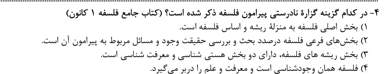3) انسان در زندگی روزانه خویش، با سوالهایی رو به رو میشود که می تواند ساعاتی طولانی فکر او را به آن مشغول کند و این همان سوالات بنیادین اند. از همان آغازین روزهای حیات انسان در زمین، افرادی اهمیت پرسش های فلسفی را دریافته و برای رسیدن به پاسخ آن تلاش کرده اند. و در گزینه 2 عنوان شده که فلسفه مثل سایر دانش ها قانون به خصوصی دارد.و نیز هر دانشی روش مخصوص به خود دارد.