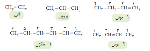 در آلکن های راست زنجیر دارای 4 اتم کربن یا بیش تر، پیوند دوگانه می تواند در موقعیت های متفاوتی قرار گیرد. به همین دلیل آلکن مورد نظر از سمت نزدیک تر به پیوند دوگانه شماره گذاری می شود و محل پیوند دوگانه با شماره نخستین کربنی که به پیوند دوگانه متصل است مشخص می شود. سپس قبل از آلکن مورد نظر شماره کربن دارای پیوند دوگانه آورده می شود.