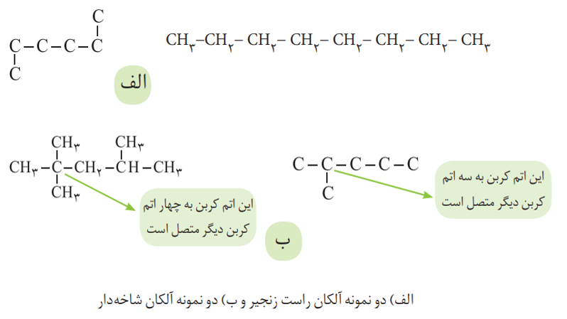 2- آلکان های شاخه دار: در این آلکان ها، برخی کربن ها به سه یا چهار اتم کربن دیگر متصل اند.
