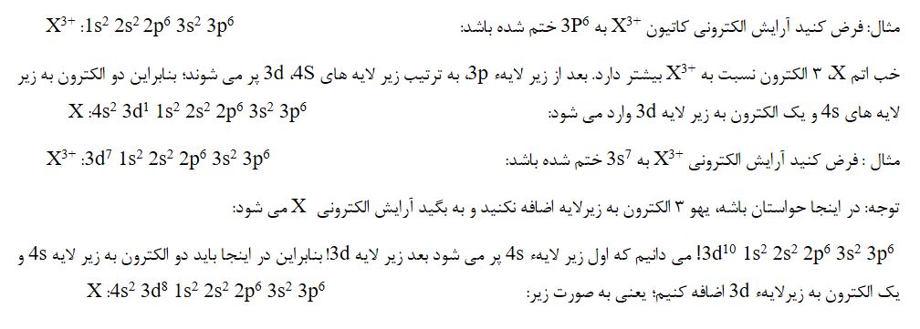 اگر آرایش الکترونی کاتیونی داده شود و بخواهید آرایش الکترونی اتم خنثی را بنویسید باید به تعداد بار مثبت و به ترتیب پر شدن زیر لایه ها به آرایش کاتیون الکترون اضافه کنید.