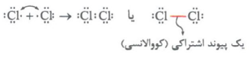 در آرایش الکترون - نقطه ای اتم کلر، یک الکترون جفت نشده وجود دارد؛ بنابراین هر اتم کلر به دنبال آن است که تک الکترون خود را با تک الکترون اتم کلر دیگر به اشتراک بگذارد تا هر دو به آرایش هشت تایی برسند. با تشکیل مولکول Cl2، دو الکترون موجود بین دو اتم، به هر دوی آنها تعلق دارد. به این جفت الکترون اشتراکی، پیوند اشتراکی (کووالانسی) می گویند.