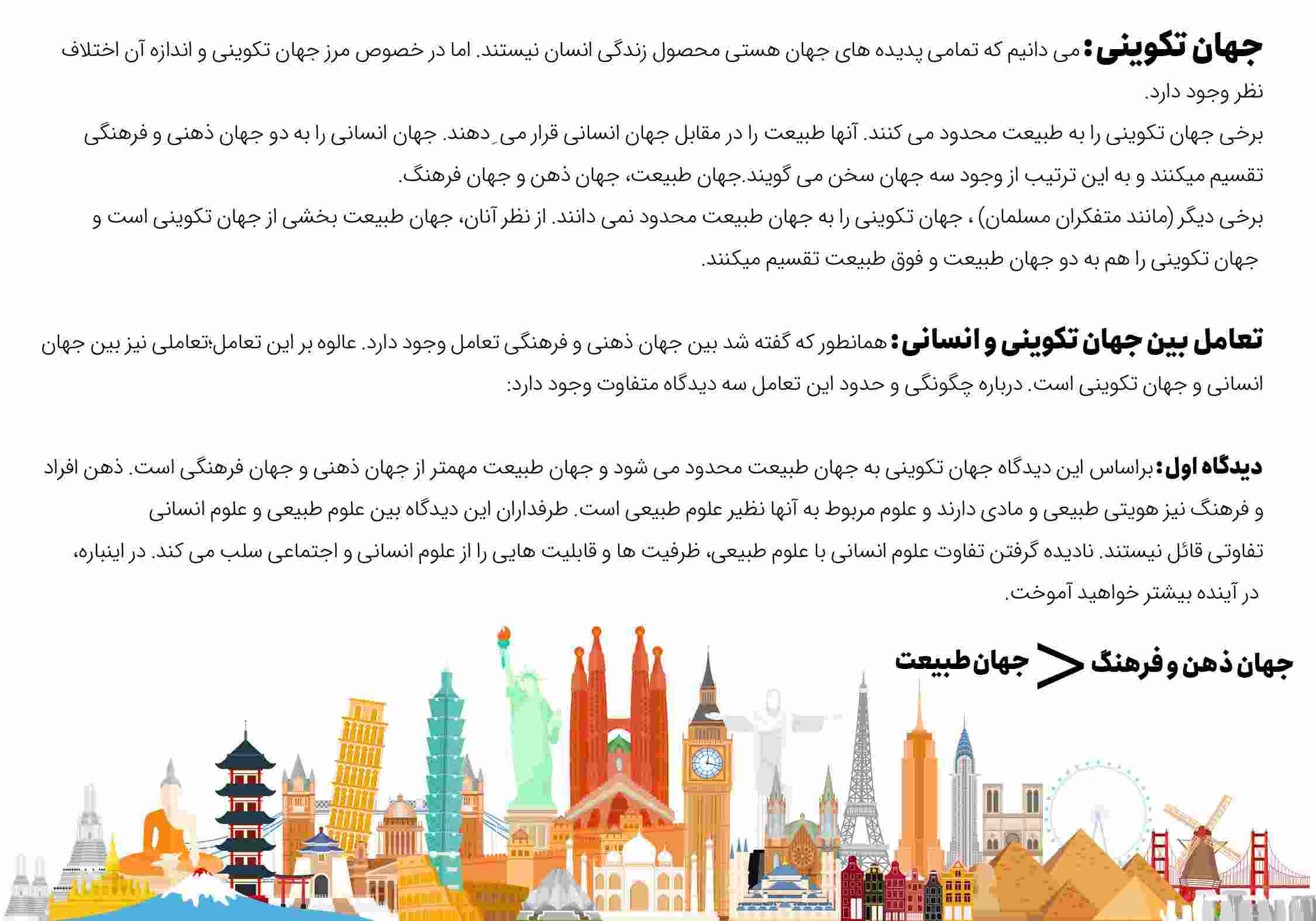 جهان طبیعت و فوق طبیعت بخشی از جهان تکوینی است و این از دیدگاه اندیشمندان مسلمان می باشد . گزینه 1 پاسخ صحیح است .