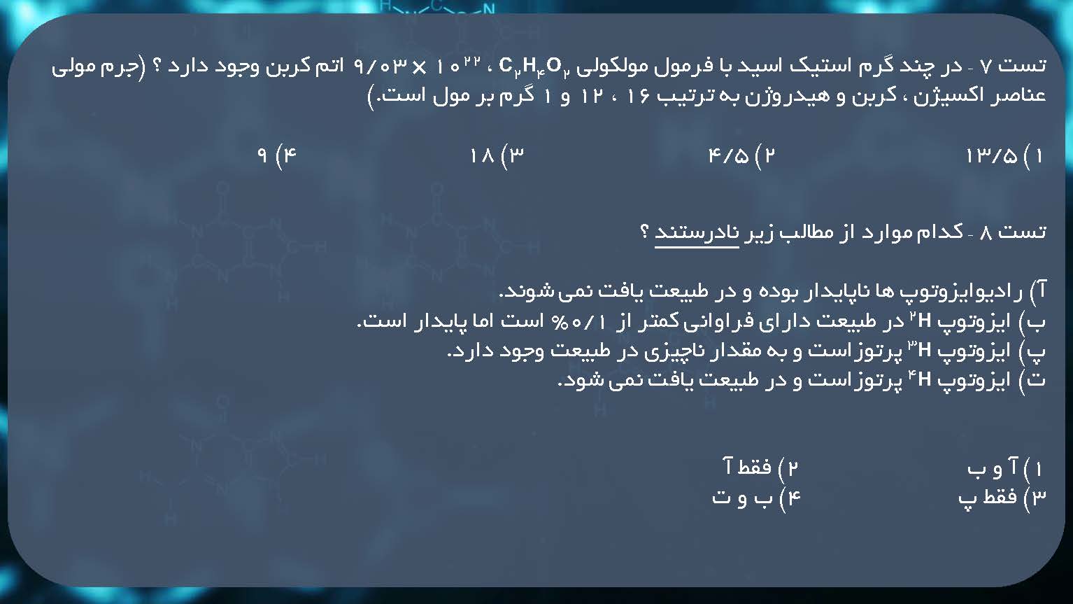 آزمونک زیر، آزمونک شیمی برای آمادگی آزمون 7 آبان و تهیه شده توسط آقای سروش عبادی، دانشجوی پزشکی ایران است. فیلم آموزشی حل سوالات در قسمت پایین مطلب پیوست شده است. بعد از فکر بر روی سوالات، در صورتی که موفق به حل آنها شدید و یا موفق به حل نشدید، فیلم حل سوالات رو نگاه کنید.