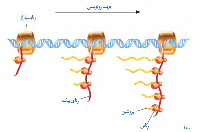 - هر چه به سمت انتهای ژن حرکت می کنیم، طول رنای پیک افزایش و تعداد ریبوزوم ها ( رناتن ها ) بیشتر می شود.
