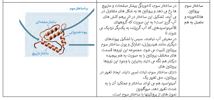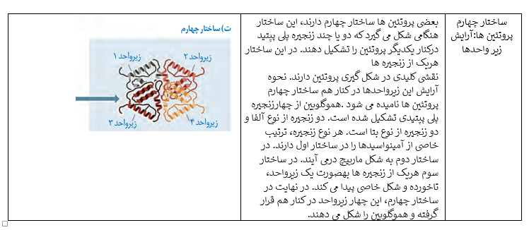ب)ساختار چهارم مخصوص پروتئین هایی است که دو یا چند زنجیره پلی پپتیدی دارند اما ساختارهای اول،دوم و سوم تنها در یک رشته پلی پپتیدی دیده می شود.