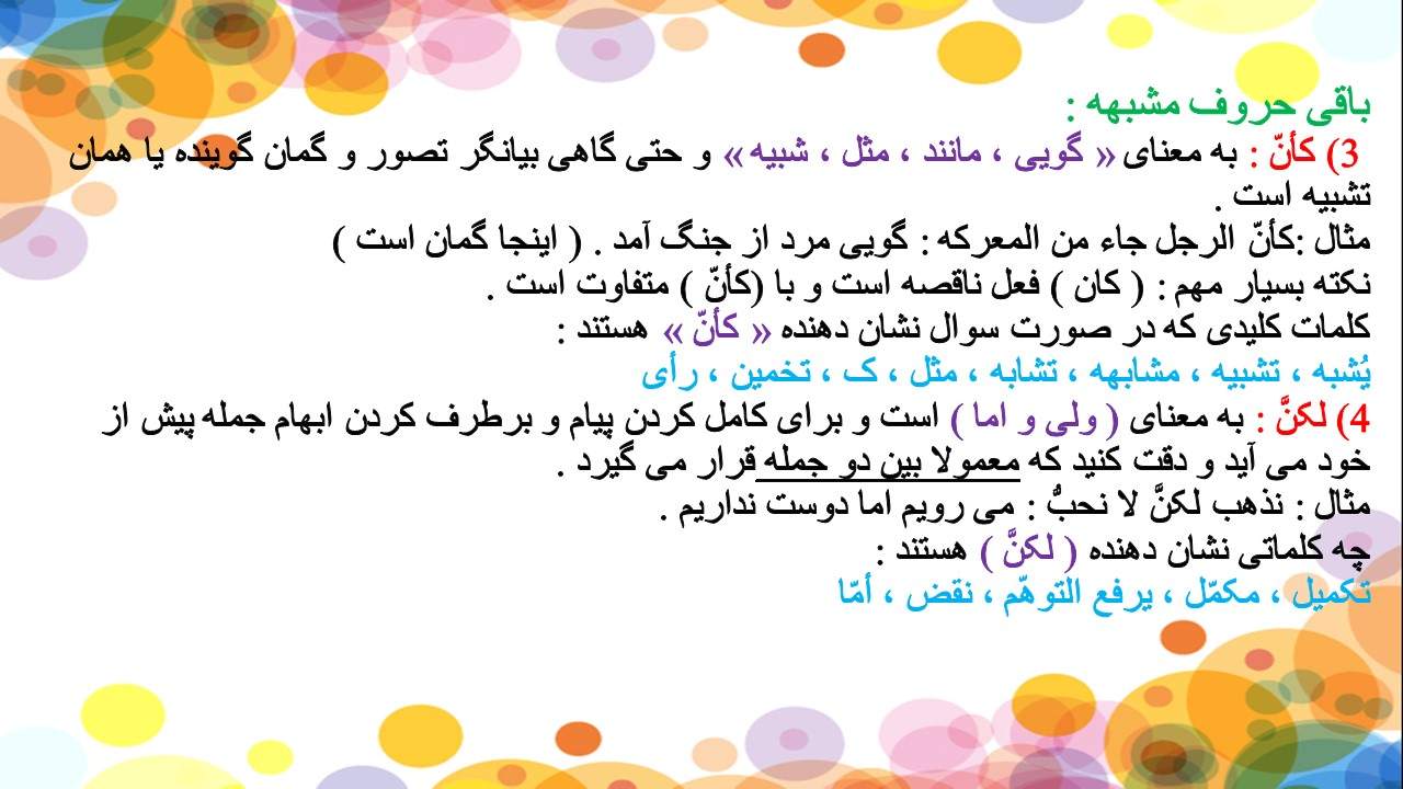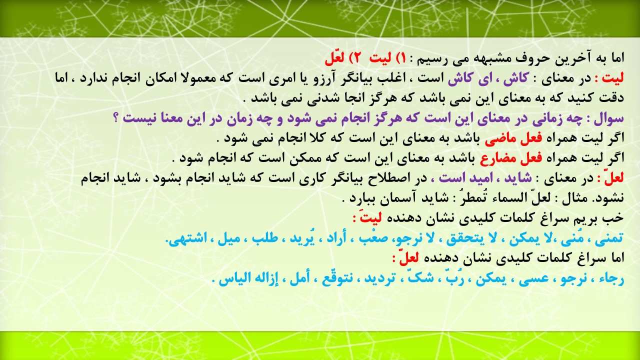 ۲) لعلّ الإنسان یَعتبِرُ مِن أخطائه الّتي ارتکبها : کاش انسان از اشتباهاتی که مرتکب شده عبرت گرفته باشد.