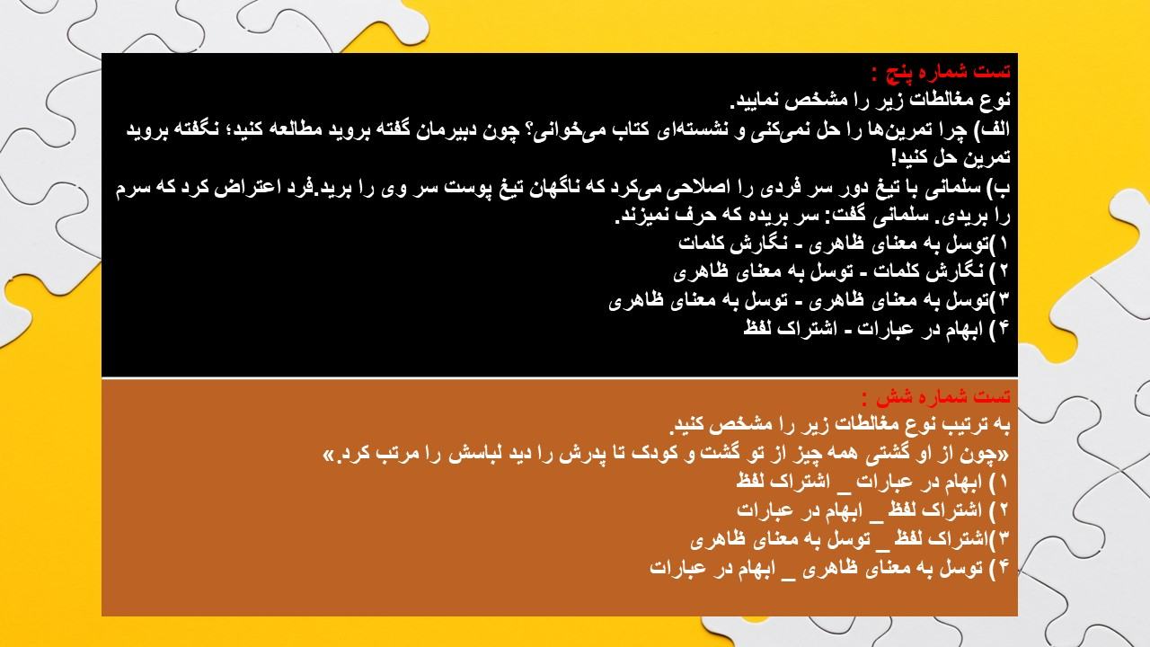 درعبارت اول فعل «گشتن» موجب سفسطه اشتراک لفظ شده. در عبارت دوم نیز «ش» در«لباسش» مرجع مشخصی ندارد. پاسخ گزینه 2 است . ✅ پاسخ تست هفت :