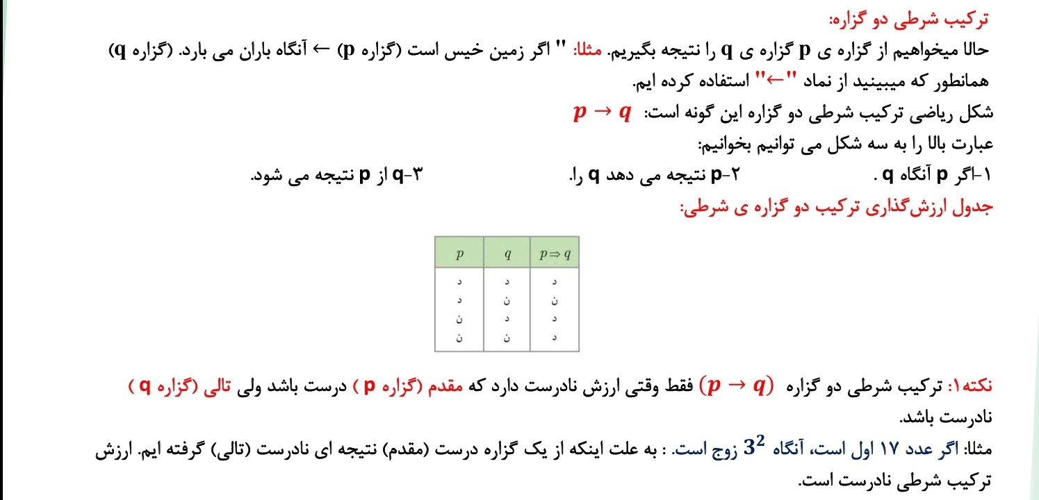 سپس مبحث ترکیب شرطی دو گزاره ( فصل اول ریاضی و آمار یازدهم) رو با هم بررسی میکنیم.