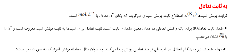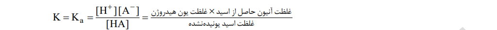 • سامانههای تعادلی را از دیدگاه کمّی نیز میتوان بررسی کرد به طوری که این سامانه ها با کمیتی به نام ثابت تعادل(K) توصیف میشوند. با قراردادن غلظت تعادلی گونههای شرکتکننده در واکنش یونش اسیدهای ضعیف در رابطه ثابت تعادل، مقدار K برای این واکنش به صورت زیر به دست میآید: