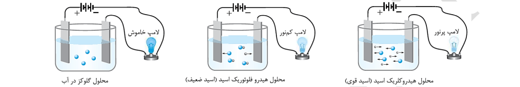 تصویر زیر، رفتار سه محلول مختلف را در مسیر جریان الکتریسیته نشان میدهد: