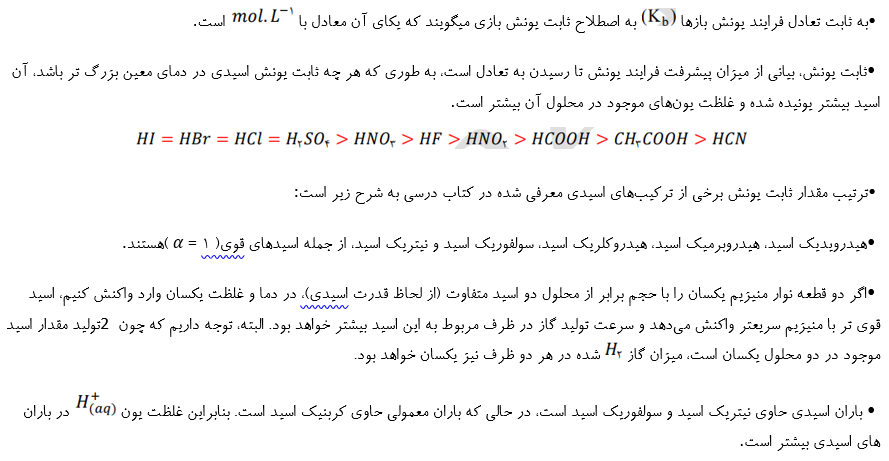 • اسیدها را بر اساس میزان درجه یونش آنها میتوان به دو تقسیم بندی کرد. دسته اول اسیدهای قوی هستند که میتوان یونش آنها را در آب کامل در نظر گرفت1 ≅ a) ) و دستهی دوم، اسیدهای ضعیف هستند که در آب به میزان جزئی یونیده میشوند. در این رابطه، داریم: