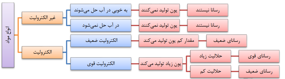 • در نمودار زیر، رفتار انواع مواد و محلول ها در برابر جریان الکتریسیته مقایسه شده است: