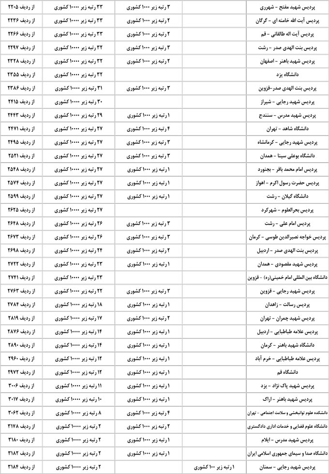 جدول اسامی برترهای انسانی ، نام شهرها ، رشته ها و دانشگاه ها