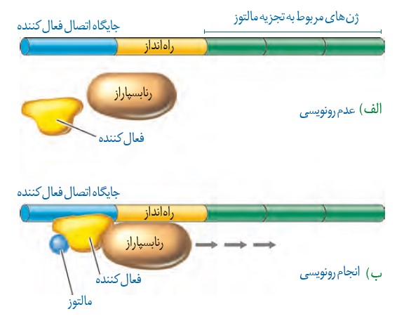 سیستم ژن های تجزیه کننده مالتوز در باکتری اشرشیاکلای به صورت تنظیم مثبت رونویسی بوده تا در صورت کمبود گلوکز، باکتری بتواند با تجزیه مالتوز، نیاز خود را برطرف کند، در این ژن ها، برای پیدا شدن، ابتدا پروتئین های متنوع فعال کننده به جایگاه اتصال خود در قبل از راه انداز متصل می شوند و سپس به اتصال رنابسپاراز به راه انداز کمک می کنند. در حقیقت مالتوز به فعال کننده، سبب چسبیدن فعال کننده به جایگاه اتصال خود در دنا شده و سپس به اتصال رنابسپاراز به راه انداز و حرکت آن به سمت نقطه شروع رونویسی کمک می کند. در این ژن ها، عوامل رونویسی ( گزینه 1 )، مهار کننده ( گزینه 2 )، و سنتز مالتوز ( گزینه 3 ) وجود ندارد.