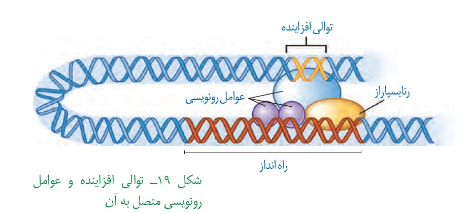 - گروهی از عوامل رونویس به نواحی خاصی از راه انداز و گروهی به بخش های دیگر مانند توالی افزاینده متصل می شوند.