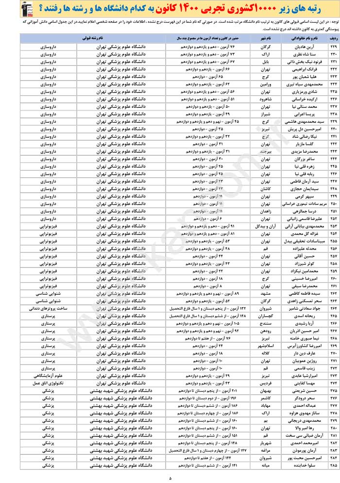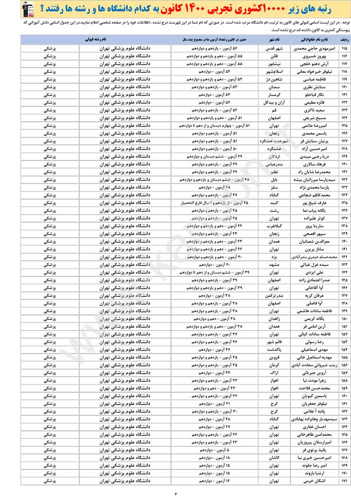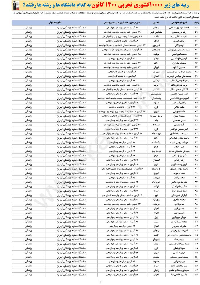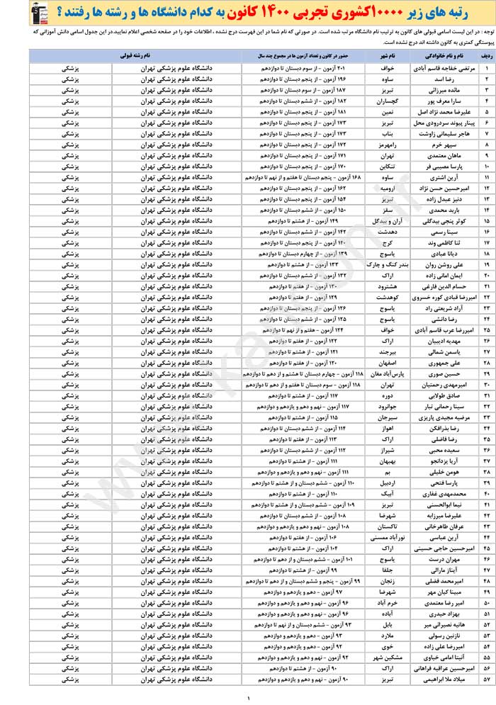 جدول اسامی برترهای تجربی ، نام شهرها ، رشته ها و دانشگاه ها