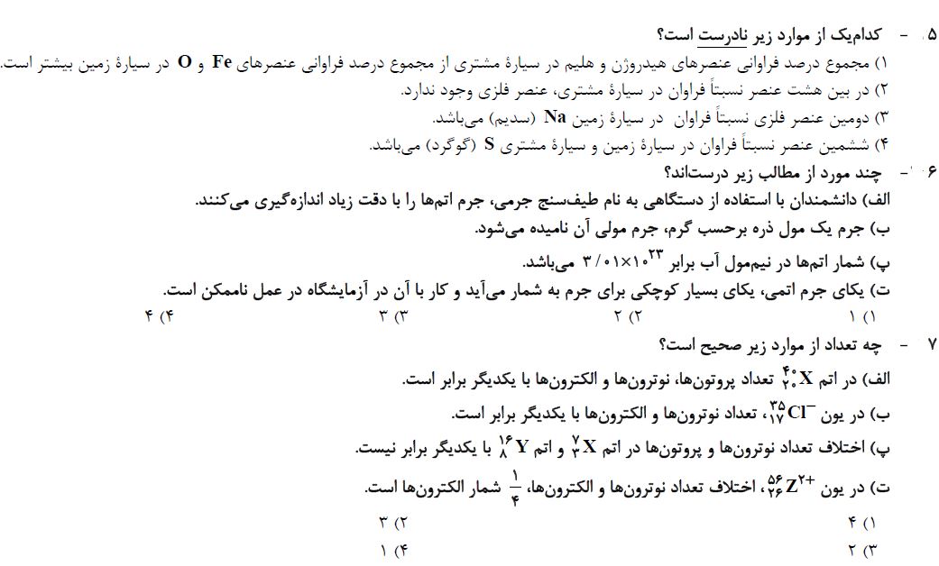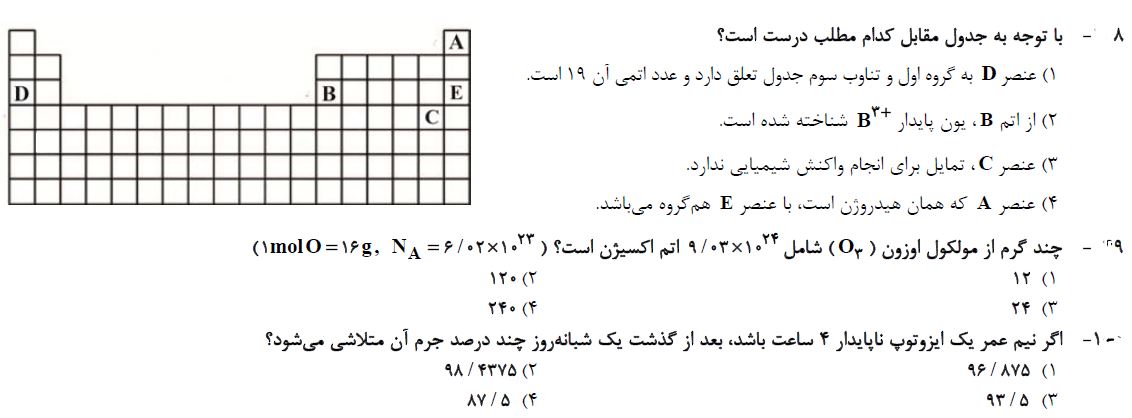 10 سوال شیمی دهم که در ادامه برای شما قرار دادیم، جمع بندی مباحث آزمون 6 آبان بوده و برای آمادگی بیشتر شما در این آزمون توسط فاطمه احدزاده رتبه 373 رشته ریاضی سال 95 انتخاب و برای شما قرار داده شده است. بعد از مطالعه ی کتاب درسی و درسنامه های آمادگی آزمون 6 آبان، توصیه میکنم حتما این سوالات را حل کرده و جواب های خود را با پاسخنامه بررسی کنید.